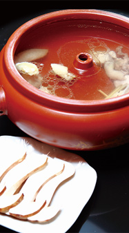 配云南"山珍野菌之王"松茸、保持地道滇味传统云南气锅鸡烹调工艺、养嘴养身的松茸汽锅鸡,很是招人爱。此菜挑选云南著名的南华新鲜松茸和武定壮鸡为原料;一直烧到砂锅中的水蒸汽从汽管回到汽锅内变成汤,鸡肉熟透才端下汽锅,用原锅上桌请客享用,汤色金黄,松茸鲜美、鸡肉滋嫩,原汁原味,清澈透明,鲜香无比。